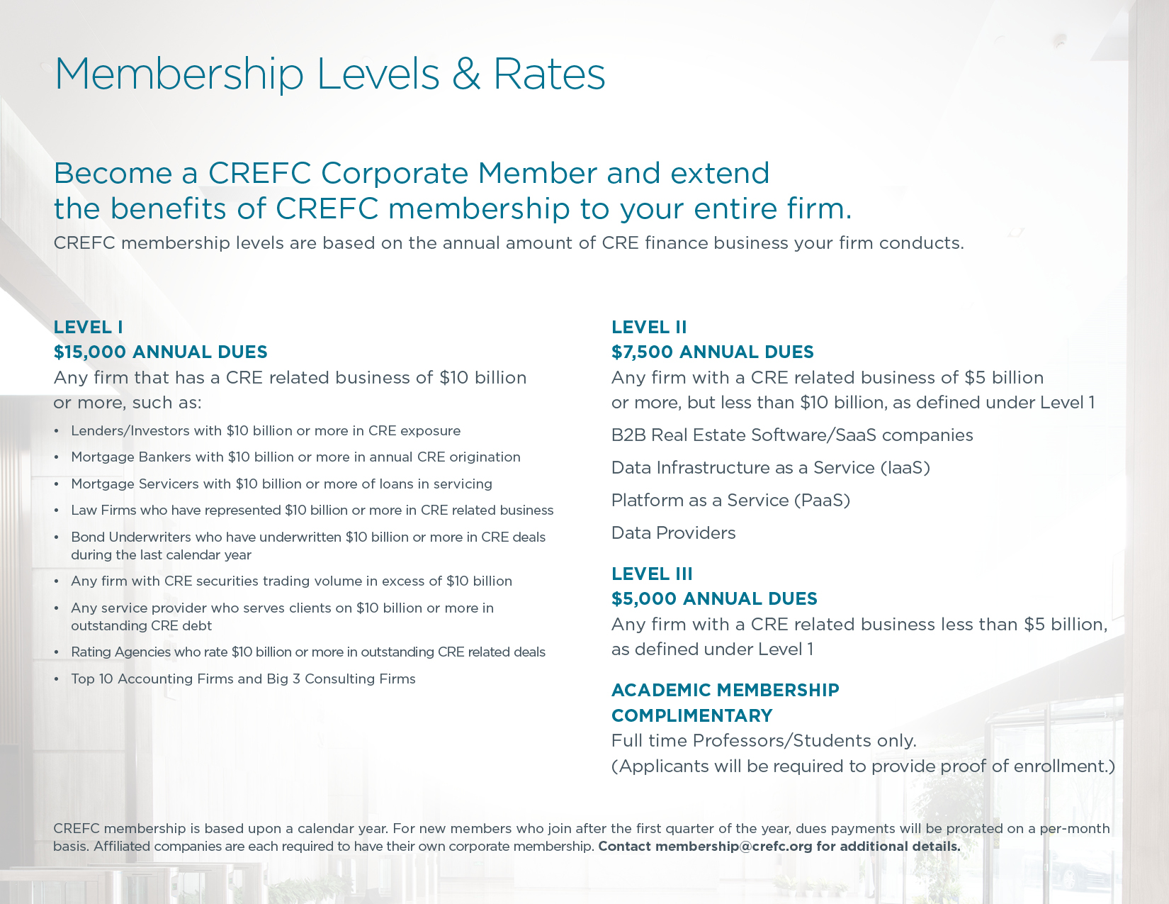 CREFC member firms participate in effecting change within the commercial real estate finance industry. Each membership level grants a firm one voting representative and unlimited employees on their member roster (except for academic members) and full benefits for every registered employee. Our membership levels are determined by the firm’s level of activity within the industry. If your firm qualifies under more than one criterion, you should register at the highest level of activity.